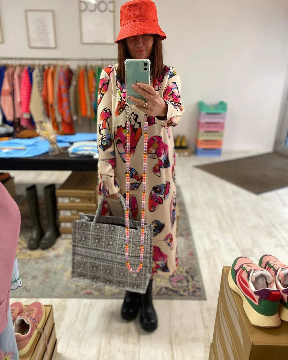 Bring Farbe in deinen Alltag – mit diesem außergewöhnlichen Kleid, das mit seinem lebhaften Print sofort gute Laune macht! Der lockere Schnitt sorgt für Bewegungsfreiheit und Komfort, während das verspielte Muster ein echtes Statement setzt. Ob kombiniert mit Gummistiefeln und Hut für einen urbanen Look oder elegant mit Sandalen gestylt: Dieses Kleid passt sich deinem Stil an – nicht umgekehrt.