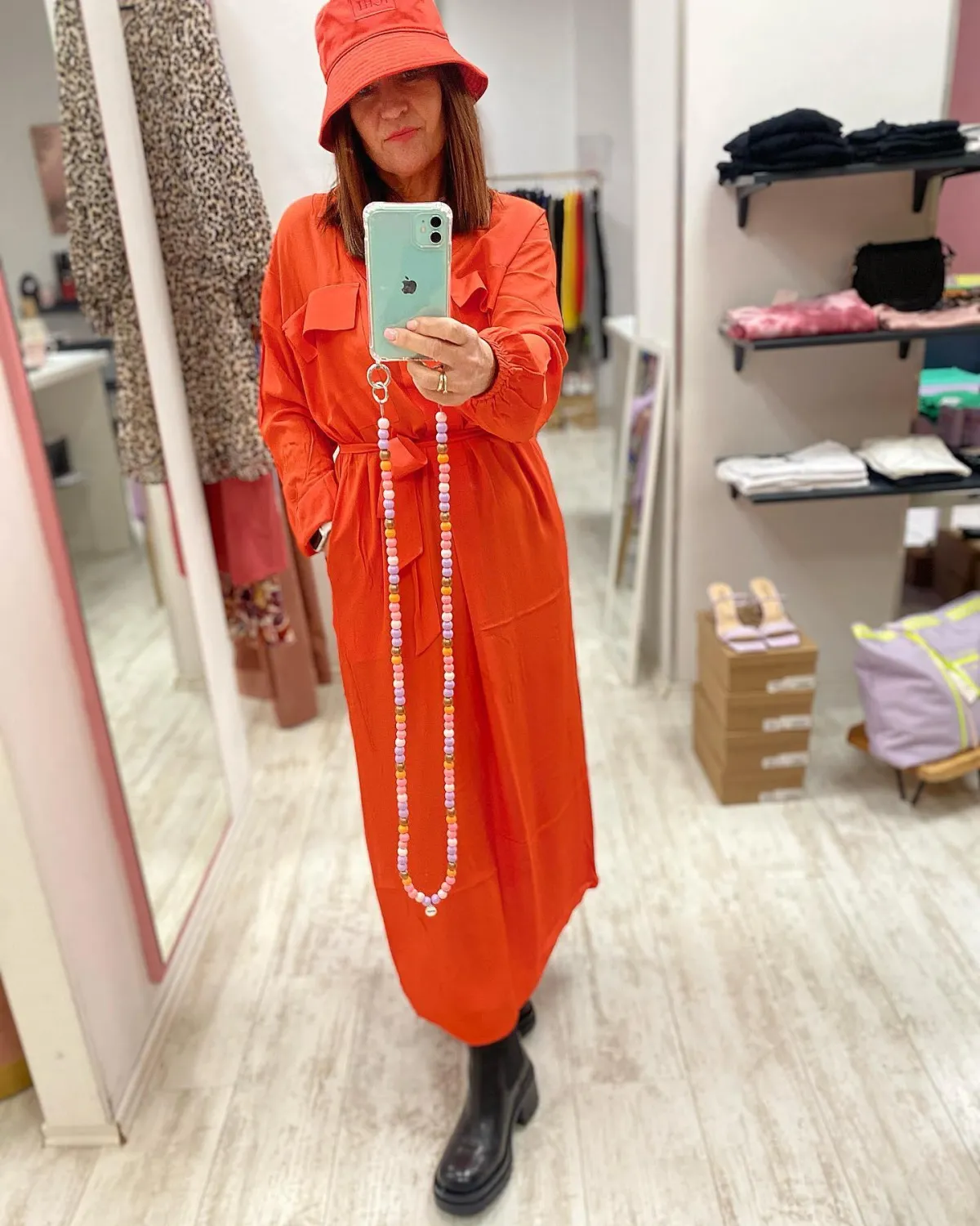 Dieses Kleid in kräftigem Orange ist ein echtes Highlight für alle, die Präsenz zeigen wollen – ohne viele Worte. Der gerade, fließende Schnitt und der Bindegürtel zaubern eine schöne Silhouette, während Brusttaschen und Ärmel mit Gummizug für lässige Details sorgen. Mit Boots und Hut getragen ergibt sich ein cooler Streetstyle, der dich garantiert aus der Masse herausstechen lässt.